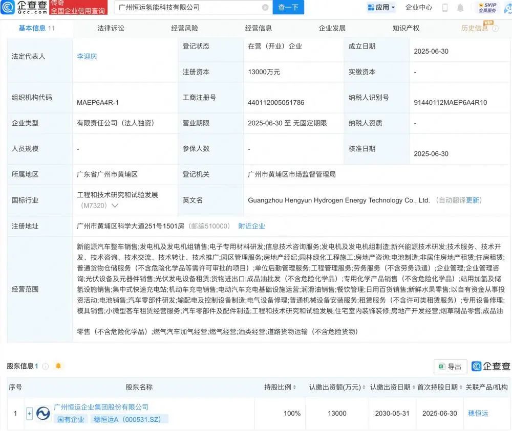 企查查消息显示,近日,广州恒运氢能科技有限公司成立,法定代表人为李迎庆,注册资本1.3亿人民币,经营范围包括新能源汽车整车销售、新兴能源技术研发、电池制造等。股东信息显示,该公司由穗恒运A(000531)全资持股。